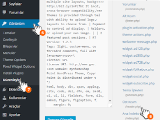 Şimdi verilerini izleyeceğimiz wordpress sitesine geçiyoruz. Kullandığımız temanın "header.php" sayfasını açalım. Burada </head> tagını arayın (CTRL-F'i kullanın). </head> tagını bulduktan sonra hemen üstüne Google Anlytics'de hafızaya kopyaladığınız kodu yapıştırın ve kaydedin.